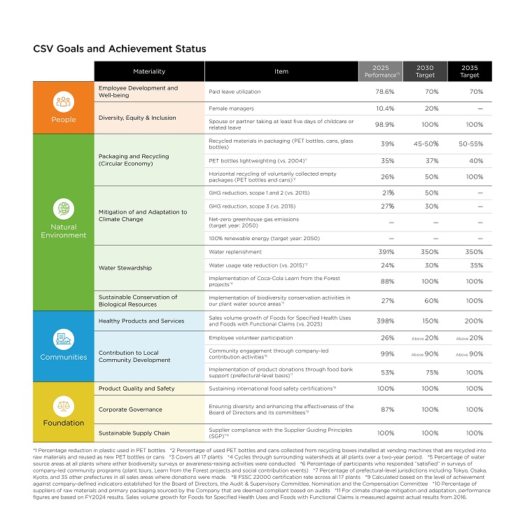 Creating Shared Value (CSV) forms the foundation of the Company’s sustainability strategy. The Company aims to create economic value through business growth while delivering social value by addressing societal issues. In July 2019, Coca-Cola Bottlers Japan Holdings established the CSV Goals as a framework for its non-financial targets and has since advanced concrete actions across the Group. In 2023, the Company identified and defined 13 material issues. Based on this process, the CSV Goals were organized into four categories: People, Natural Environment, Communities, and Foundation, to clarify the priority issues the Company should address. This has clarified the priority issues on which the Company should focus and enabled it to promote initiatives across the entire value chain to achieve these goals.